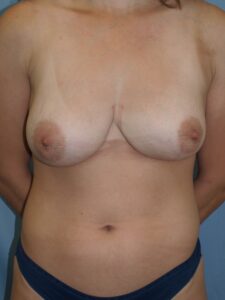 Over- sized implants exchanged for smaller more proportionate implants, and capsulorrhaphies (revision of breast pockets) performed to raise inframammary folds and to correct double bubble deformity. Revision liposuction of abdomen and mini (short scar) tummy tuck performed to help correct contour deformities from previous liposuction.