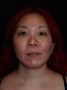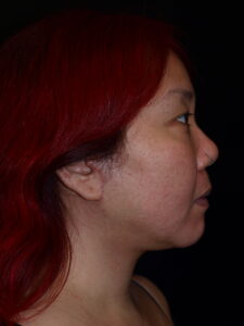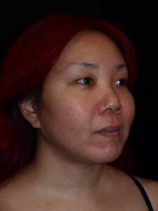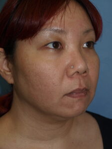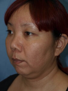 34 year old female with facial asymmetry secondary to resection of bony tumor and resulting asymmetric volume loss. Results are 2 months following fat grafting to tear troughs, cheeks, nasolabial folds, submalar regions, lips, chin and anterior jawline.